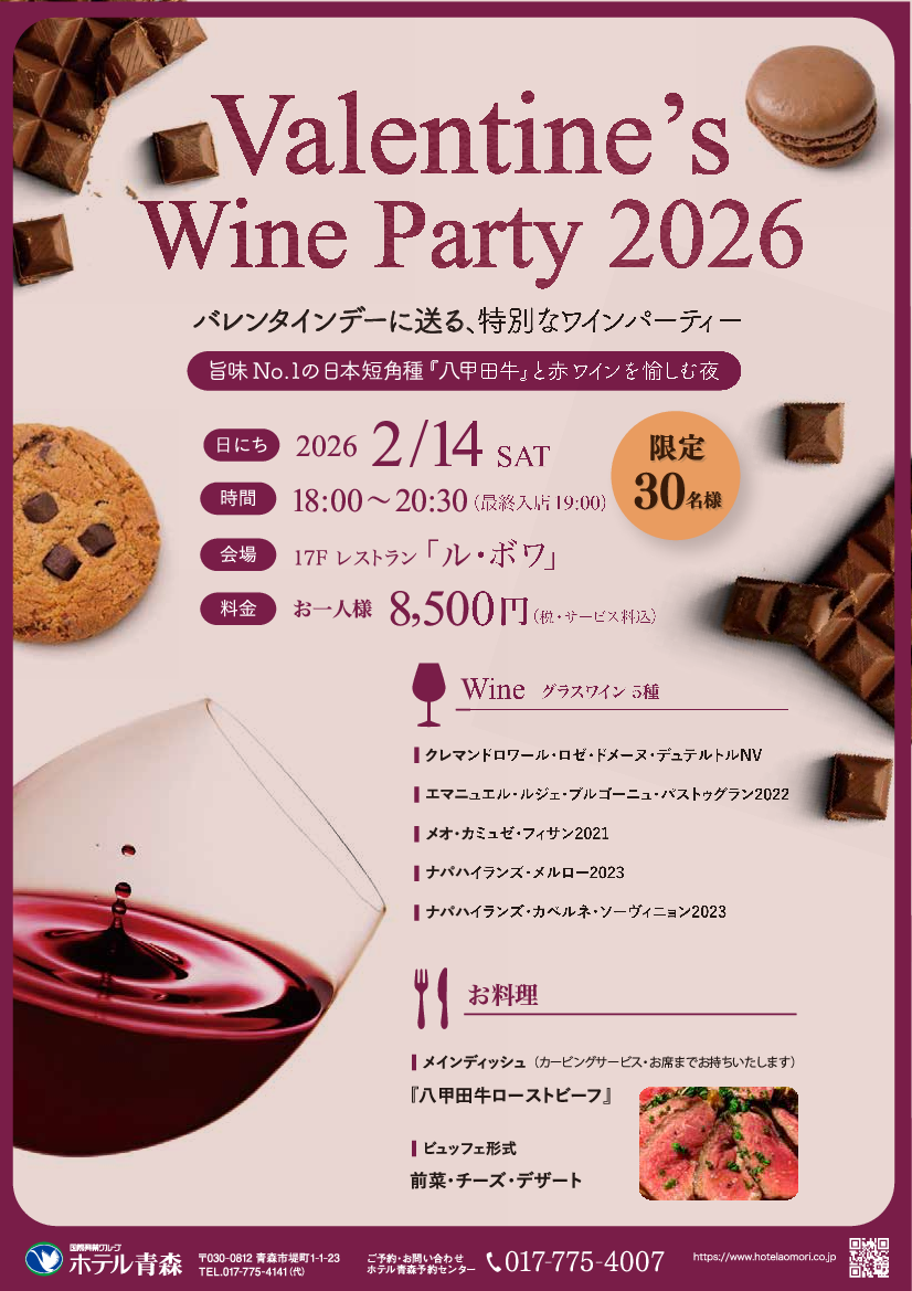 | 内容 | ・メインディッシュ【八甲田牛ローストビーフ】 ※お席にお持ちいたします ・前菜・チーズ・デザート ブッフェ形式 お飲み物 【ソムリエ厳選グラスワイン】 ・スパークリングワイン×1種 ・赤ワイン×4種 |