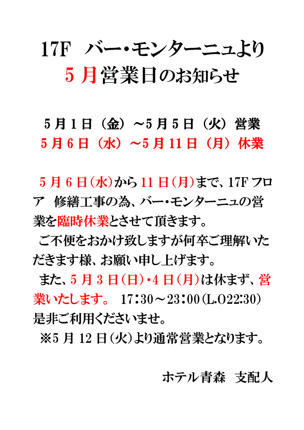バー・モンターニュ 5月営業日のお知らせ