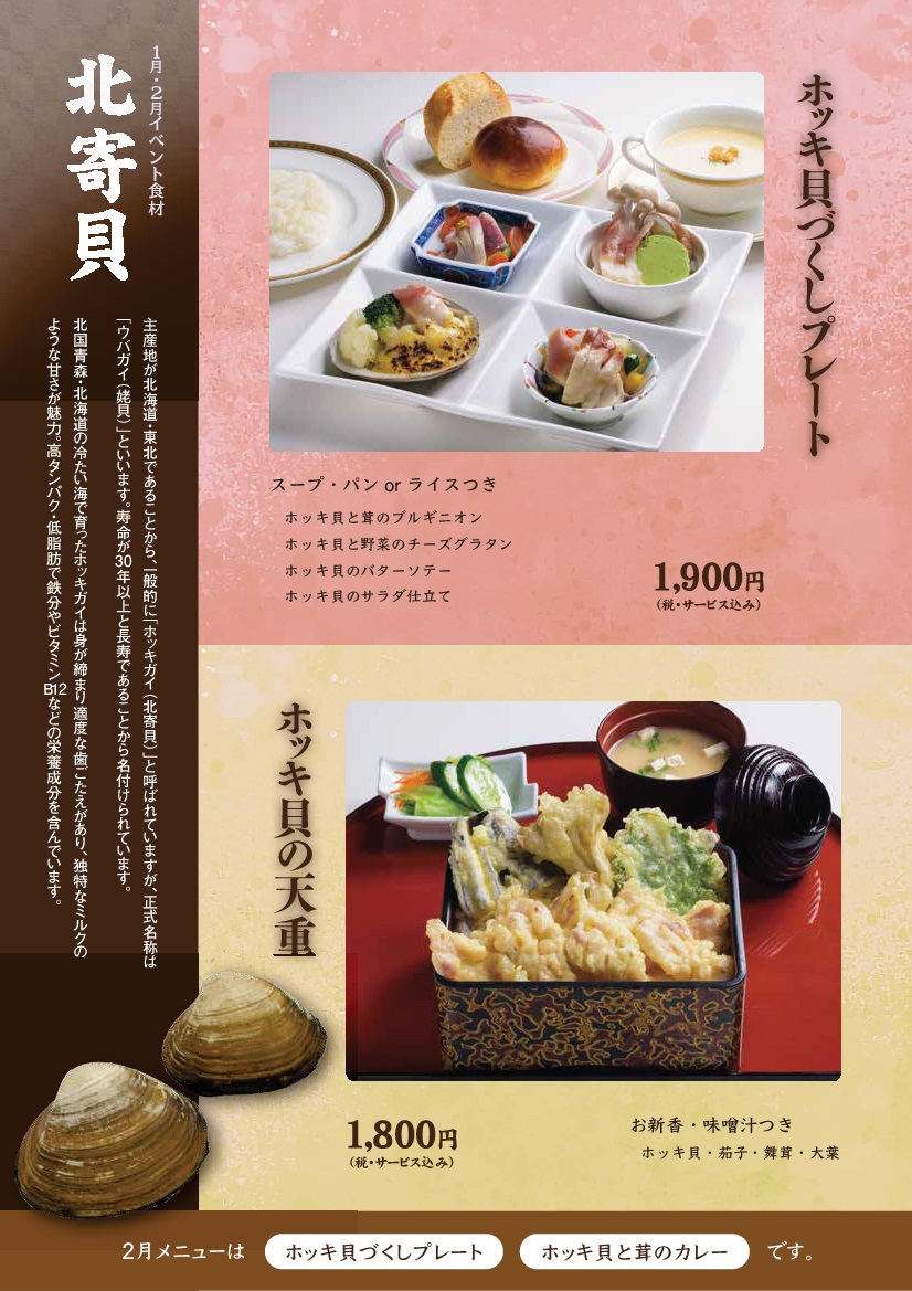 1月は「ホッキ貝づくしプレート」と「ホッキ貝の天重」をご用意しております(^o^)/