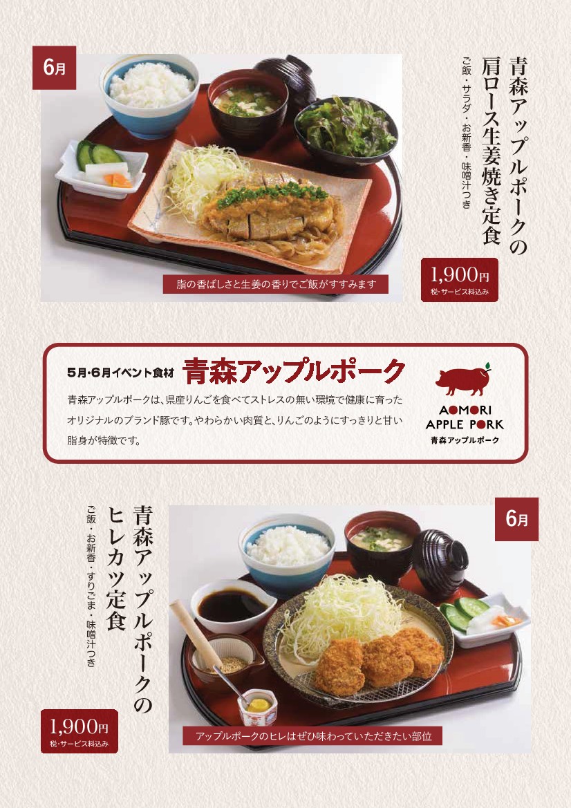 6月「青森アップルポークの肩ロース生姜焼き定食」と「青森アップルポークのヒレカツ定食」をご用意しております(^o^)/
