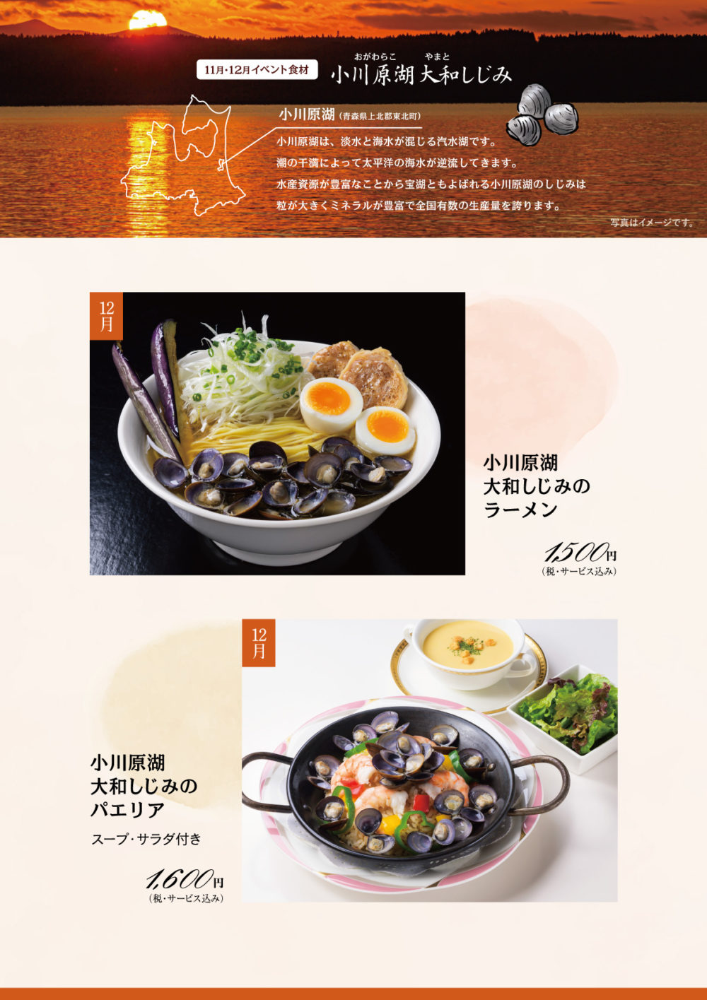 12月は「小川原湖大和しじみのラーメン」「小川原湖大和しじみのパエリア」をご用意しておりますのでぜひご賞味ください(^o^)/